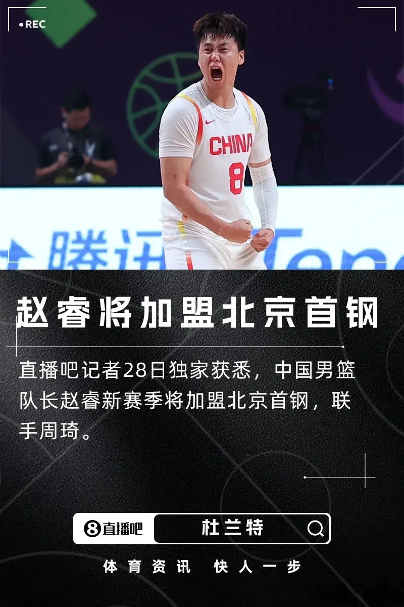 据《直播吧》记者独家透露,中国男篮队长赵睿新赛季将加盟北京首钢,帮助北京首钢夺得CBA总冠军奖杯。