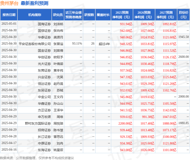 证券之星数据中心根据近三年发布的研报数据计算,平安证券股份有限公司张晋溢研究员团队对该股研究较为深入,近三年预测准确度均值高达93.11%,其预测2025年度归属净利润为盈利948.32亿,根据现价换算的预测PE为20.49。